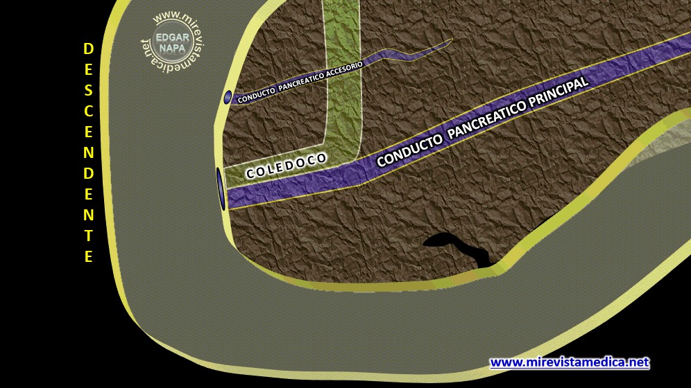Alcanza la parte posterointerna de la tercera porción del duodeno, atraviesa su pared y se abre hacia la cavidad intestinal.