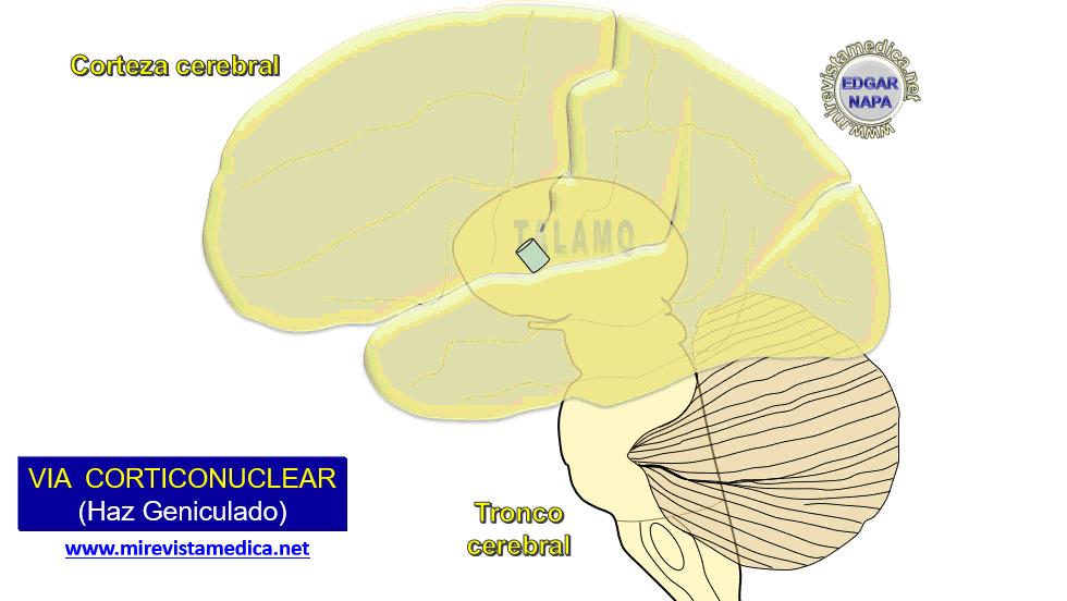 - Bilateralmente , hacia los núcleos del Oculomotor (III) , motor del nervio Trigémino (V) , en la parte caudal del núcleo del Facial (VII) (los músculos de la frente), y en el núcleo Ambiguo (X).