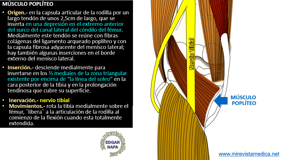 Movimientos.- rota la tibia medialmente sobre el fémur, ¨libera¨ a la articulación de la rodilla al comienzo de la flexión cuando esta totalmente extendida.