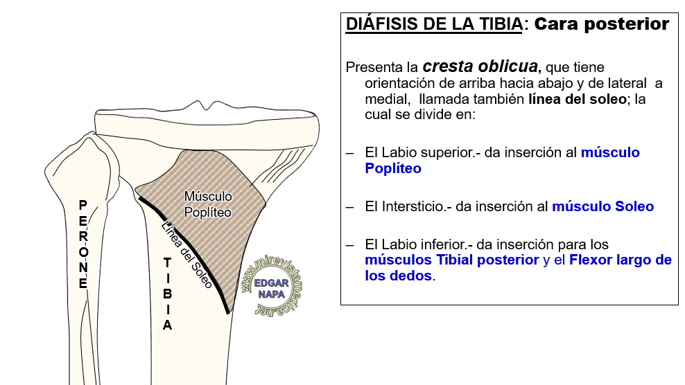 Inserción.- desciende medialmente para insertarse en los ⅔ mediales de la zona triangular existente por encima de “la línea del soleo” en la cara posterior de la tibia y en la prolongacion tendinosa que cubre su superficie.