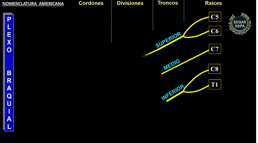 - Tronco superior. formado por la unión de las ramas ventrales de C5 y C6. Desciende hacia afuera y abajo dando la división anterior y posterior.
