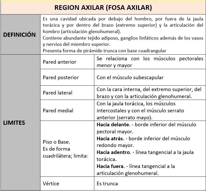 Contiene abundante tejido adiposo, ganglios linfaticos ademas de vasos y nervios del miembro superior