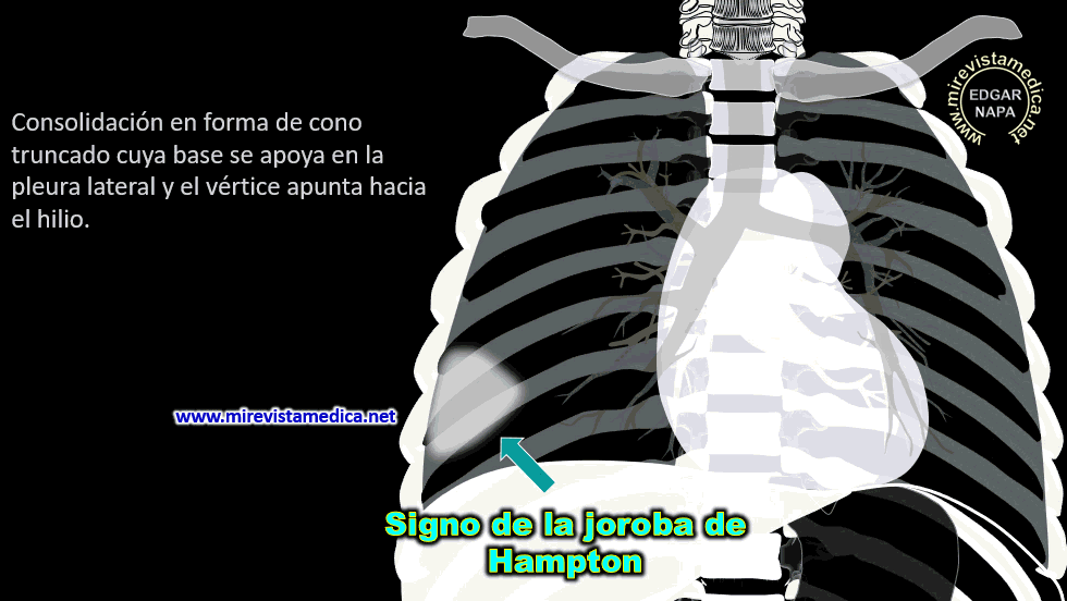 Imagen radiopaca (consolidación) en forma de cono truncado y cuyo vértice apunta hacia el hilio pulmonar.